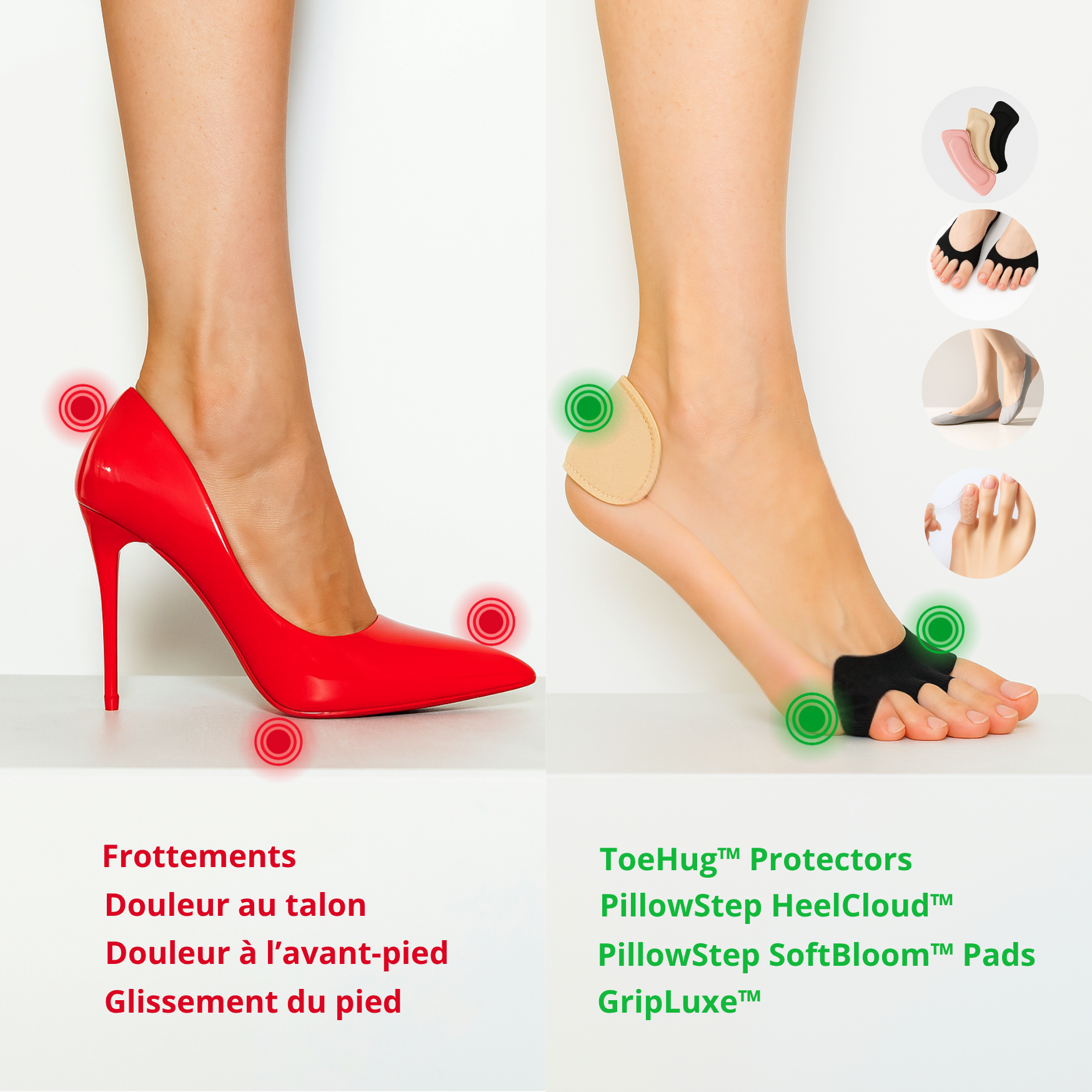 Nos kits sont conçus pour répondre aux 4 causes principales d’inconfort dans les talons : glissement du pied, ampoules, douleurs au talon et manque de stabilité. Chaque protection agit de manière ciblée pour un confort immédiat et durable, du matin jusqu’à la fin de la soirée.